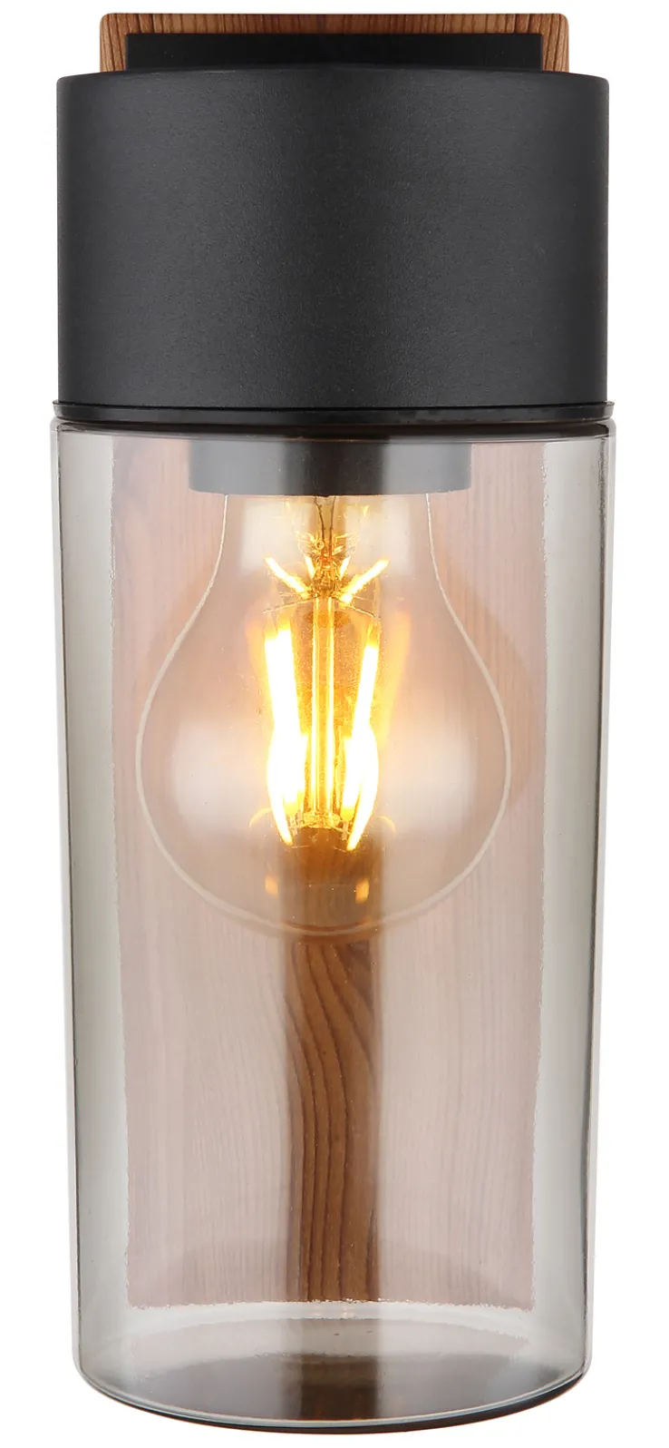 Die spritzwassergeschützte Außenlampe ETSI von GLOBO verfügt über einen Korpus in brauner Holzoptik und schwarzem Edelstahl. Daran ist ein zylindrisches Glas aus transparentem grauen Glas befestigt. In die E27 Retrofit Fassung können unterschiedliche LEDs mit bis zu 40 Watt Leistungsverbrauch eingeschraubt und bei Bedarf einfach gewechselt werden. So kann die Lichtfarbe- und -helligkeit der Außenwandleuchte ETSI aus dem Hause GLOBO nach den eigenen Bedürfnissen festgelegt werden.