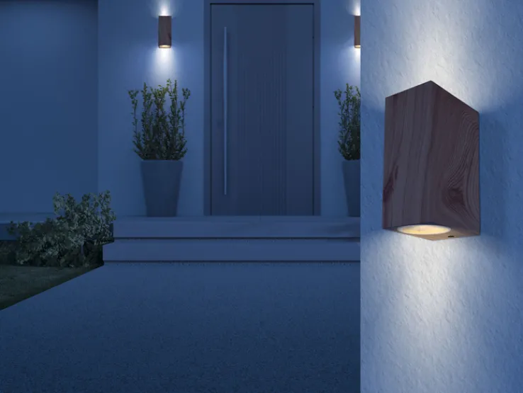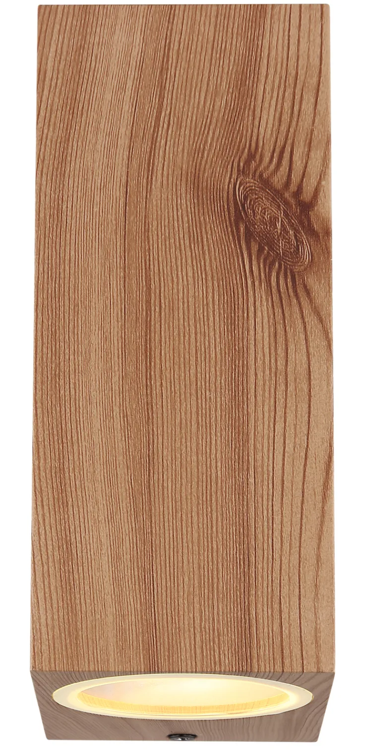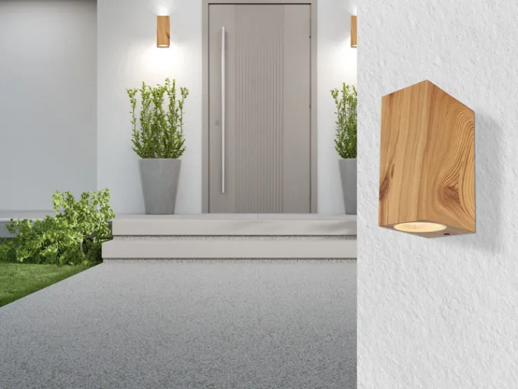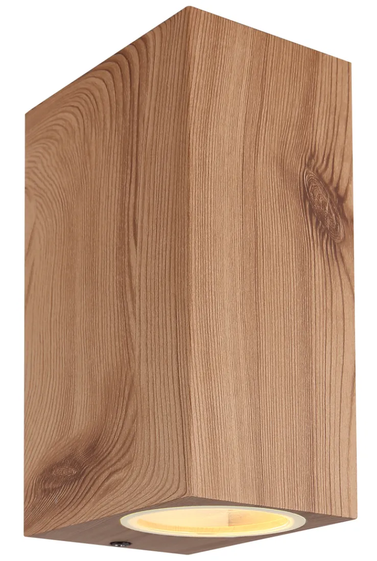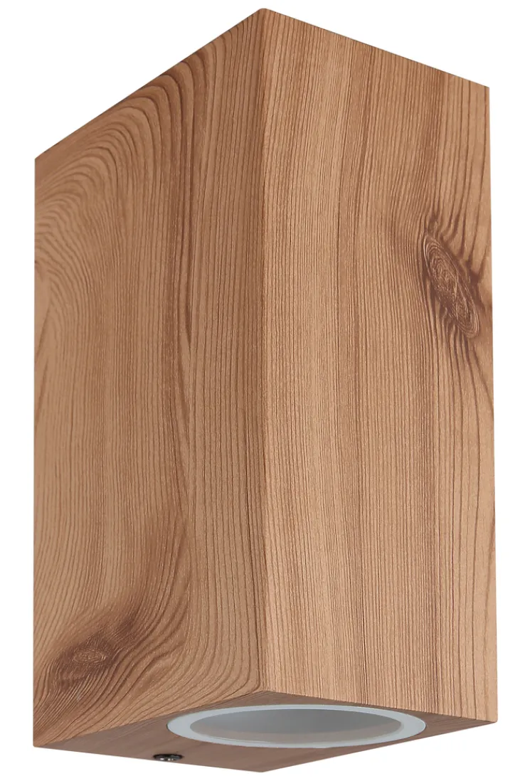 Die Retrofit Außenwandleuchte VERONIKA ist aus leichtem Aluminium Druckguss gefertigt. Die Oberflächen sind in einem schön gemaserten Holzdekor gestaltet. Für diverse AGL- und Retrofit Leuchtmittel bis 35 Watt ist die Außenleuchte mit zwei GU10-Fassungen ausgestattet.