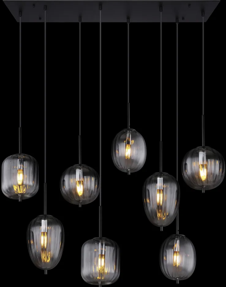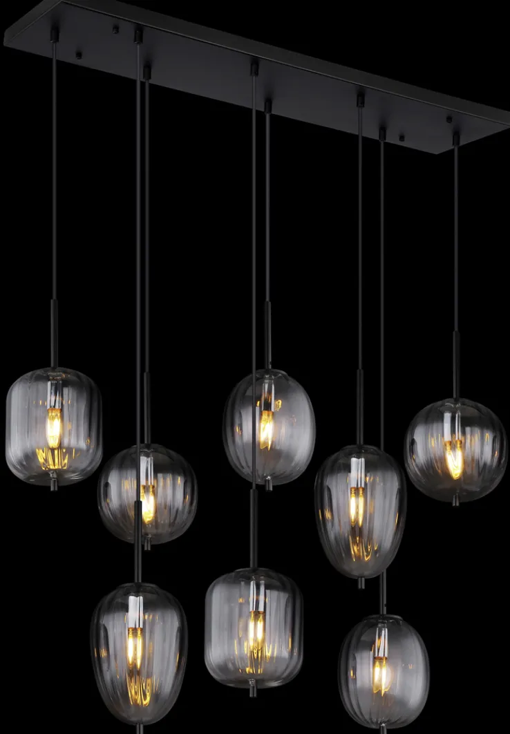 Das Balkenpendel ATTILA von Globo vereint stilvolles Design mit funktionaler Beleuchtung. Mit einer Breite von 102,5 cm und einer Höhe von 120 cm fügt sie sich harmonisch in verschiedene Raumkonzepte ein. Die Leuchte besteht aus hochwertigem Metall und Rauchglas, was ihr eine elegante Optik verleiht. Die acht Brennstellen sind für E14-Leuchtmittel geeignet, die nicht im Lieferumfang enthalten sind, und leicht ausgetauscht werden können. Die Hauptfarbe schwarz kombiniert mit rauchfarbenem Glas sorgt für ein modernes Ambiente. Die Leuchte ist in der Schutzklasse 1 und mit der Schutzart IP20 ausgestattet, was sie ideal für den Innenbereich macht. Der Energieverbrauch beträgt maximal 320 W. Diese Pendelleuchte ist perfekt für den Einsatz über Esstischen oder in Wohnbereichen geeignet und bietet eine gleichmäßige Ausleuchtung. Die bauchige Form der Glaskörper verleiht der Leuchte eine besondere Note.