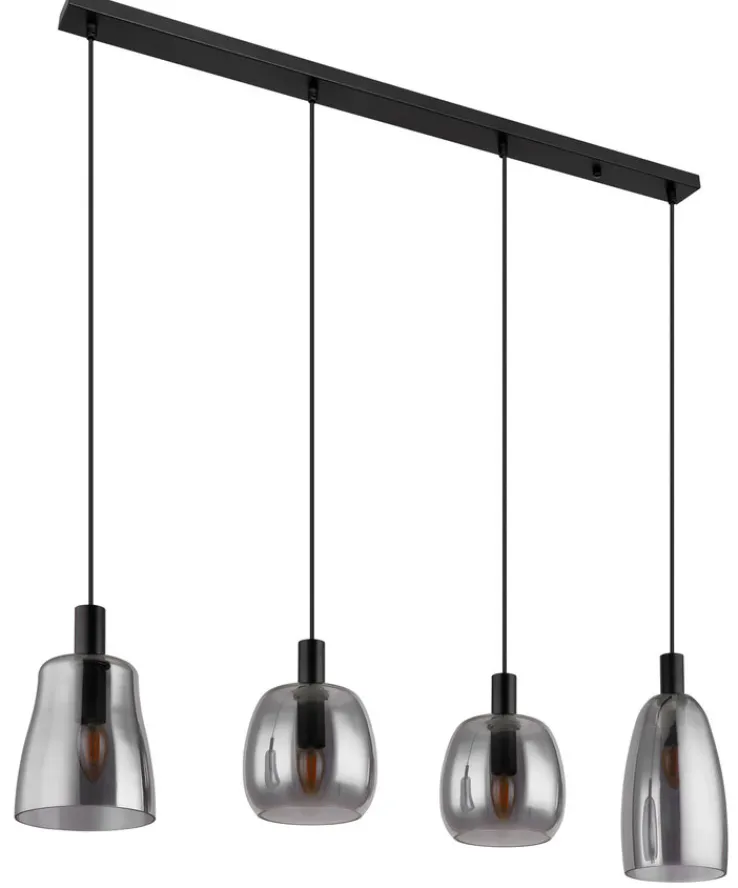 Bei der Pendellampe GARRI von GLOBO hängen vier schwarze, höheneinstellbare Pendel an einer schwarzen Leiste. An jedem Pendel sind eine schwarze Lampenfassung sowie ein Schirm aus rauchfarbig grauem Glas befestigt. Dabei weisen die Glasschirme drei verschiedene Formen auf. In die E27 Retrofit Fassungen können unterschiedliche Leuchtmittel mit bis zu 40 Watt (insgesamt maximal 160 Watt) eingeschraubt werden, die dank des rauchfarbigen Glases ein leicht gedämpftes Licht ausstrahlen.