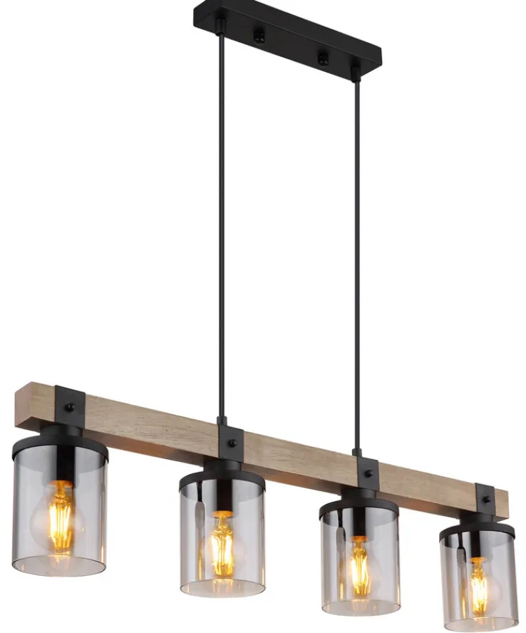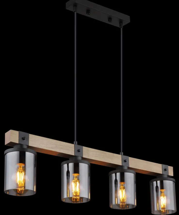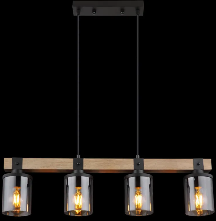 Das GLOBO Retrofit Balkenpendel LILA entzückt mit seinen rauchfarbigen, schwarz eingefassten Lampenschirmen und dem holzfarbigen Korpus. Es ist ein toller Blickfang in modern oder klassisch eingerichteten Wohnräumen.