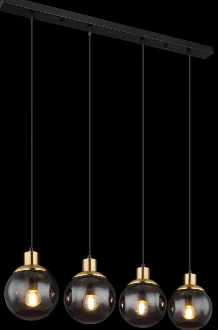 Das Retrofit Balkenpendel POTTER von GLOBO überzeugt mit seinen stilvollen kugelförmigen Lampenschirmen in einer attraktiven Farbkombination aus schwarz, rauchfarbig und messingfarbig. Es ist 75 cm breit und taucht seine Umgebung in ein behagliches, warmes Licht.