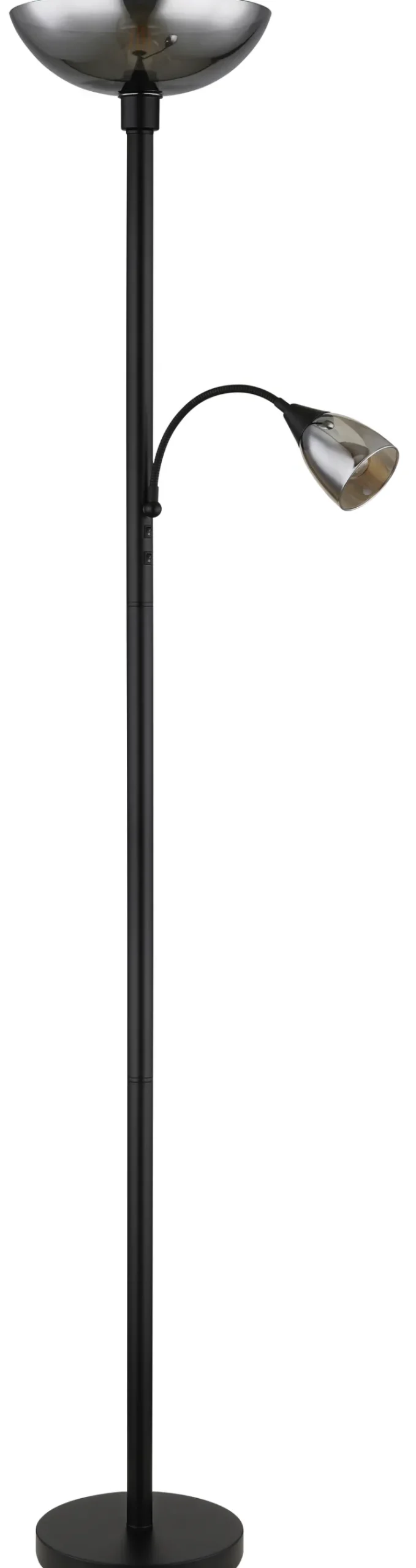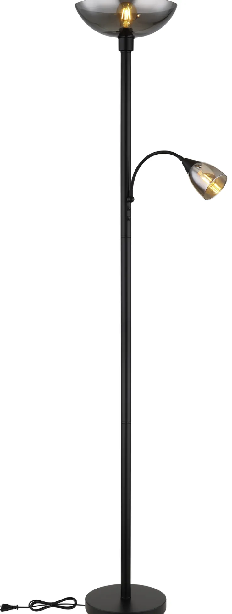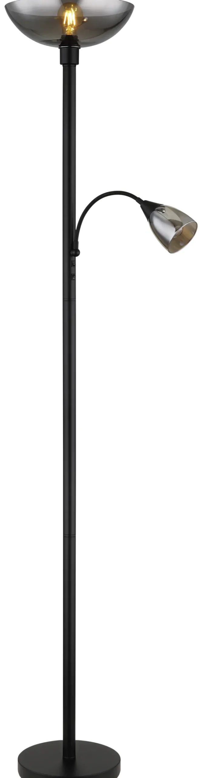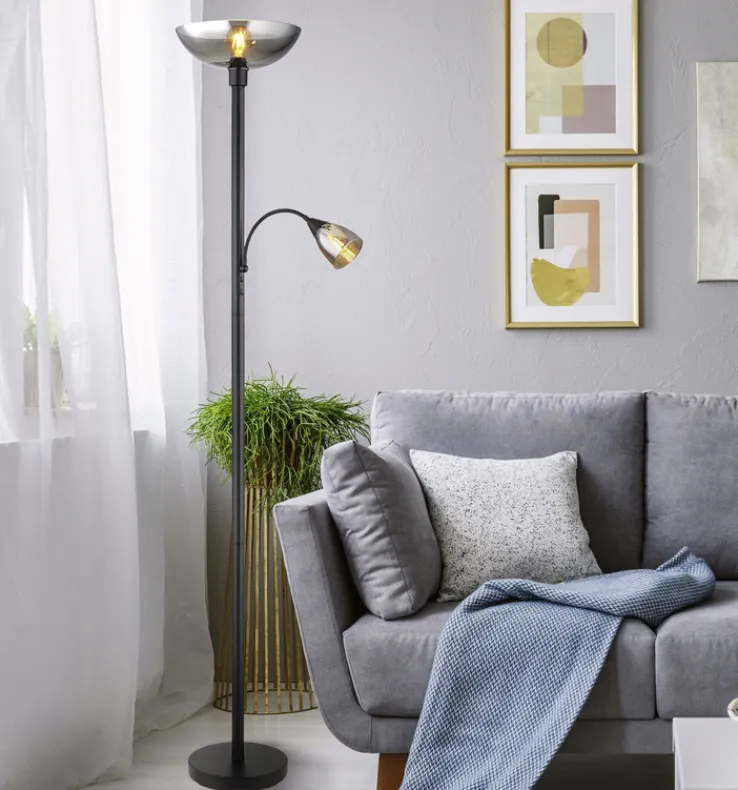 Der GLOBO Retrofit Deckenfluter mit Leselampe BLADE aus Metall in Schwarz und Rauchglas in Grau verleiht jedem Beleuchtungskonzept ein Plus an Flexibilität.