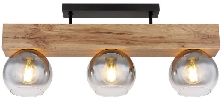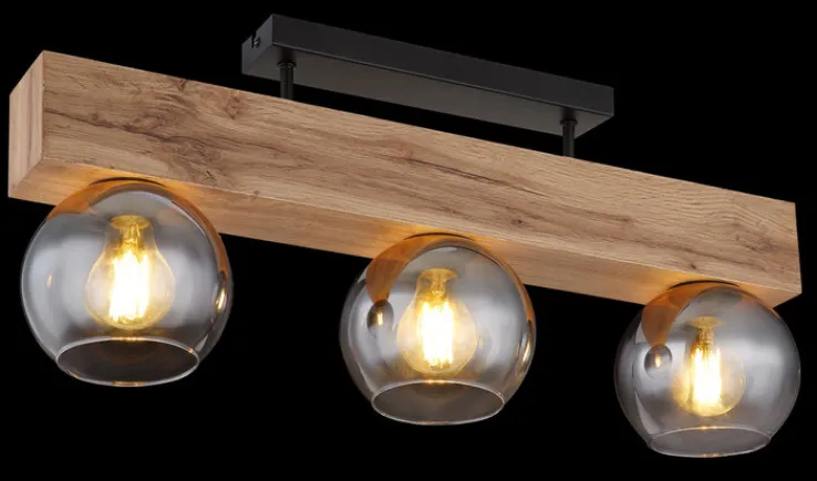 Die runden Lampenschirme der dreiflammigen Deckenleuchte sind aus Glas gefertigt und sorgen für ein angenehmes Licht. Der Korpus besteht aus Holz und Metall. Bestückt wird die Lampe mit Leuchtmitteln, die einen Energieverbrauch von insgesamt 120 Watt und die Größe E27 aufweisen. Dank ihrer attraktiven kugelförmigen Lampenschirme im Retro-Design zieht sie die Blicke auf sich und fügt sich hervorragend in die meisten Einrichtungsstile ein.