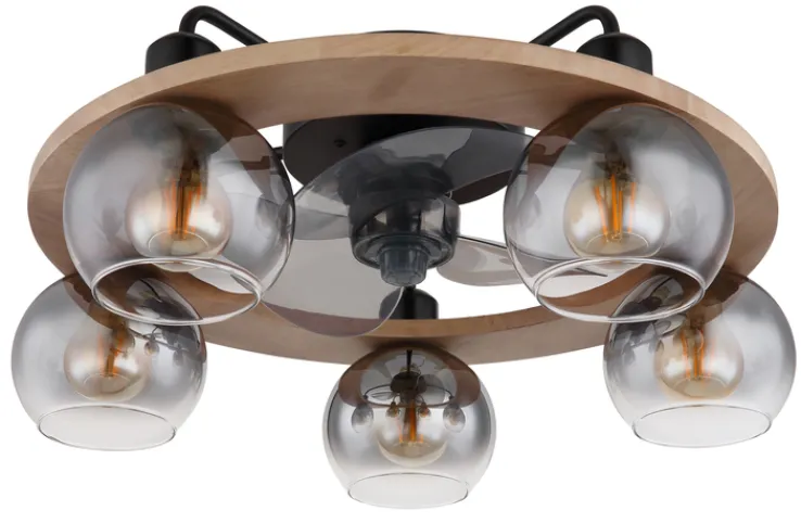 Die GLOBO Retrofit Deckenlampe NARINA mit Ventilator hat einen Durchmesser von 55 cm und eine Höhe von 21,5 cm. Sie ist aus braunem Holz, schwarzem Metall, mit rauchfarbenen Gläsern. Sie verfügt über einen Timer