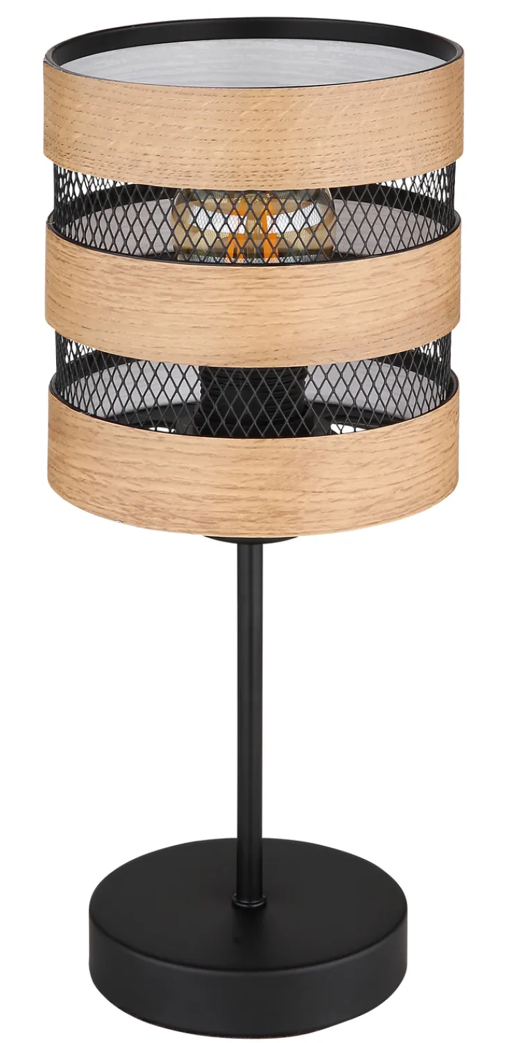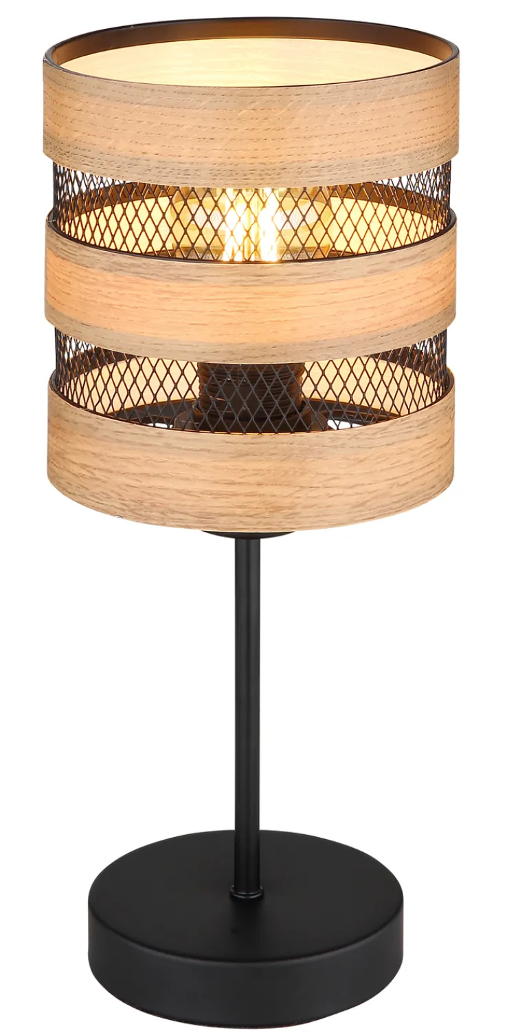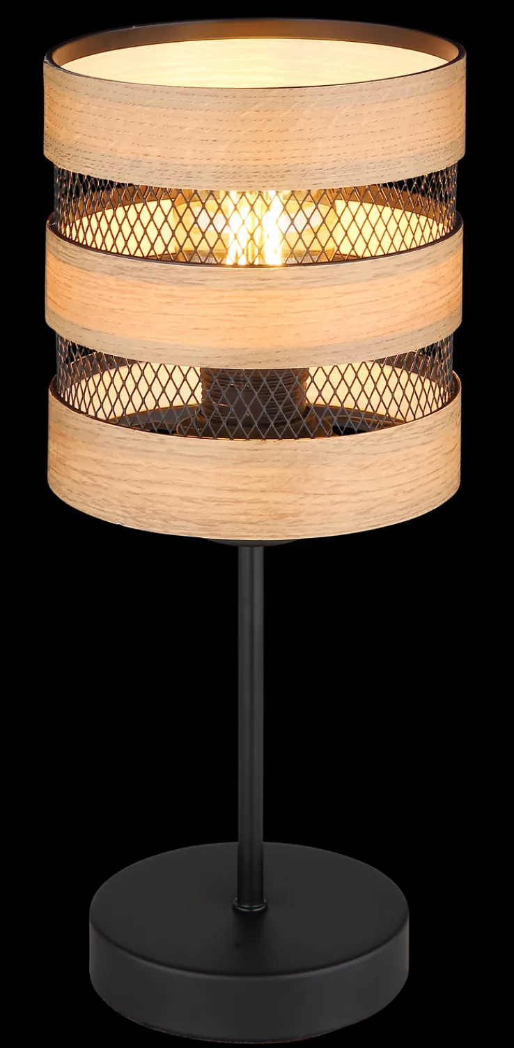 Die GLOBO Retrofit Tischlampe MOITAS ist 1-flammig mit einer Höhe von 33,5 cm. Ihr Durchmesser beträgt 15 cm. Sie ist schwarz, mit einem naturfarbenen Geflecht aus Holznachbildung und verfügt über einen Schnurschalter.