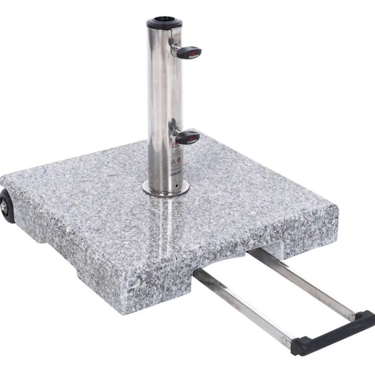 Der massive Sockel des Schirmständers besteht aus Granit und hat eine Stärke von 10 cm. Die Oberflächen sind poliert und die Kanten gefast. Die Hülse für den Sonnenschirm und der Teleskopgriff sind aus rostfreiem Edelstahl gefertigt. Die hochwertigen Rollen auf der Unterseite des Schirmständers sind aus Kunststoff hergestellt.
