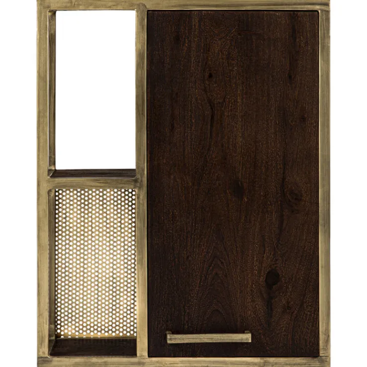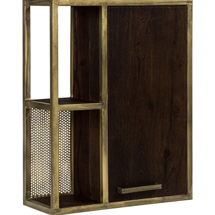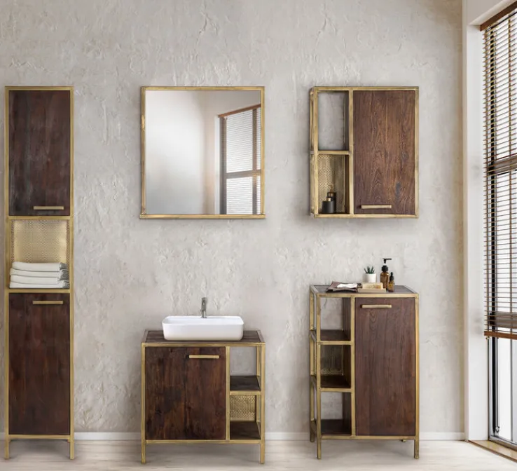 Der Hängeschrank GOLDEN BATH kombiniert Eisen in der Farbe Antikgold mit dunkelbraun gebeiztem Mango Massivholz und perfekt abgestimmten Metallgriffen. Für eine erhöhte Strapazierfähigkeit sind die Oberflächen zusätzlich geölt. Neben dem edlen Look bietet der Hängeschrank in zwei offenen und zwei geschlossenen Fächern viel Platz für Beautyzubehör und Pflegeprodukte. Das Highlight des Schranks ist jedoch seine edle Optik, die dem Badezimmer Eleganz verleiht.