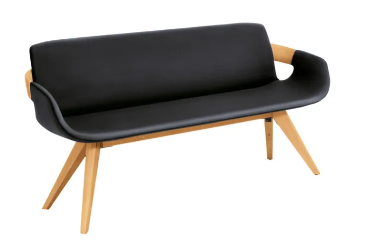 Die elegante Bank EMIL von hartmann präsentiert sich in einem stimmigen Mix aus massiver Kerneiche und hochwertig verarbeitetem Leder in der Farbe schwarz. Durch das zeitlose Design und die stilvolle Optik mit Spinngestell passt die Bank in modern oder klassisch gestaltete Raumkonzepte. Die weichen Sitz- und Rückenpolster und die hohen Armlehnen sorgen für einen hohen Sitzkomfort. Die Bank bietet Platz für 3 bis 4 Personen.