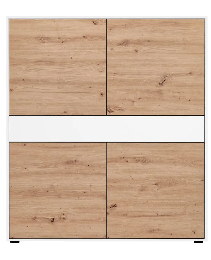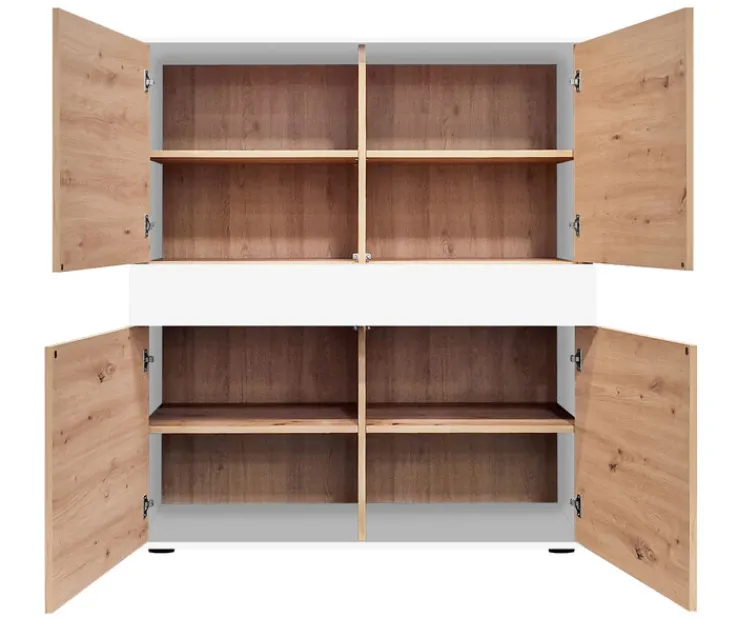 Korpus und Fronten bestehen aus einer hochwertigen Holznachbildung und verleihen dem Highboard eine hohe Stabilität. Das Highboard ist außerdem mit einem Schubkasten und vier Drehtüren ausgestattet, die über eine Push-to-Open-Funktion verfügen.