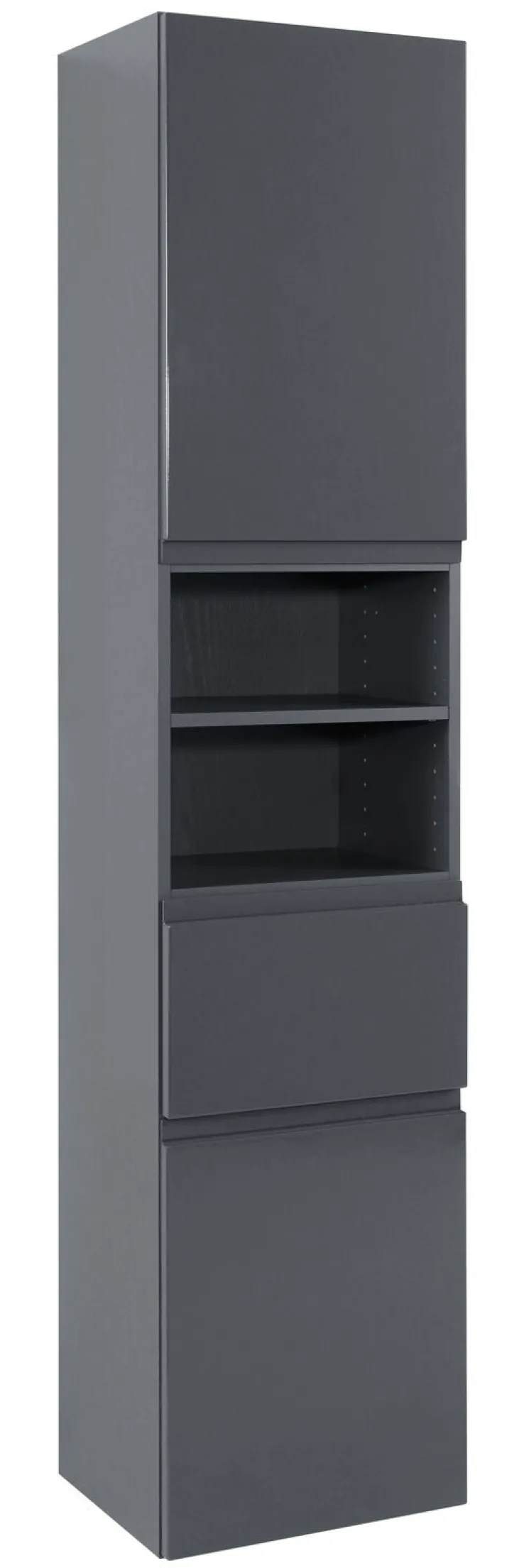 Ein Graphit Hochglanz Design macht den Hochschrank CARDIFF zum Blickfang im Badezimmer. Der graue Korpus und die graue Front sind aus einem Mix aus Holznachbildung aus mitteldichter Faserplatte (MDF) und Spanplatte sowie Kunststoff in der Art von Melaminharz und Metall gearbeitet. Der Schrank misst 180 cm in der Höhe, 40 cm in der Breite und 35 cm in der Tiefe und findet mit diesen kompakten Maßen auch in kleinen Badezimmern gut Platz.