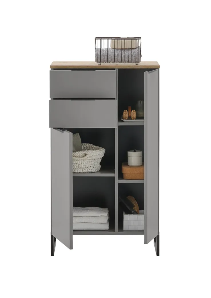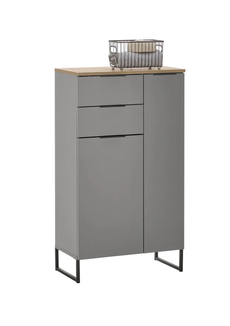 Der Schrank besteht aus Holznachbildung und verfügt über zwei Türen, hinter denen sich drei Einlegeböden befinden. Zusätzlich bietet ein offenes Fach und ein Schubkasten weiteren Stauraum für Badutensilien. Die klaren Linien und die schlichte Formgebung unterstreichen den modernen Stil des Schranks, während die stabilen Füße für einen sicheren Stand sorgen. Dieses Möbelstück ist ideal für alle, die Funktionalität und modernes Design in ihrem Badezimmer vereinen möchten.