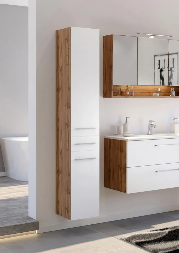 Hochschrank LIVORNO macht mit seiner schlanken und hohen Ausrichtung in kleinen und mittelgroßen Bädern eine gute Figur. Der sockellose Schrank wird an der Wand befestigt und sorgt so für eine leichte, fast schwebende Optik. Mit einer Höhe von 180 cm und einer Breite von 30 cm bietet er viel Platz zur Unterbringung von Handtüchern, Kosmetika und Hygieneartikeln.
