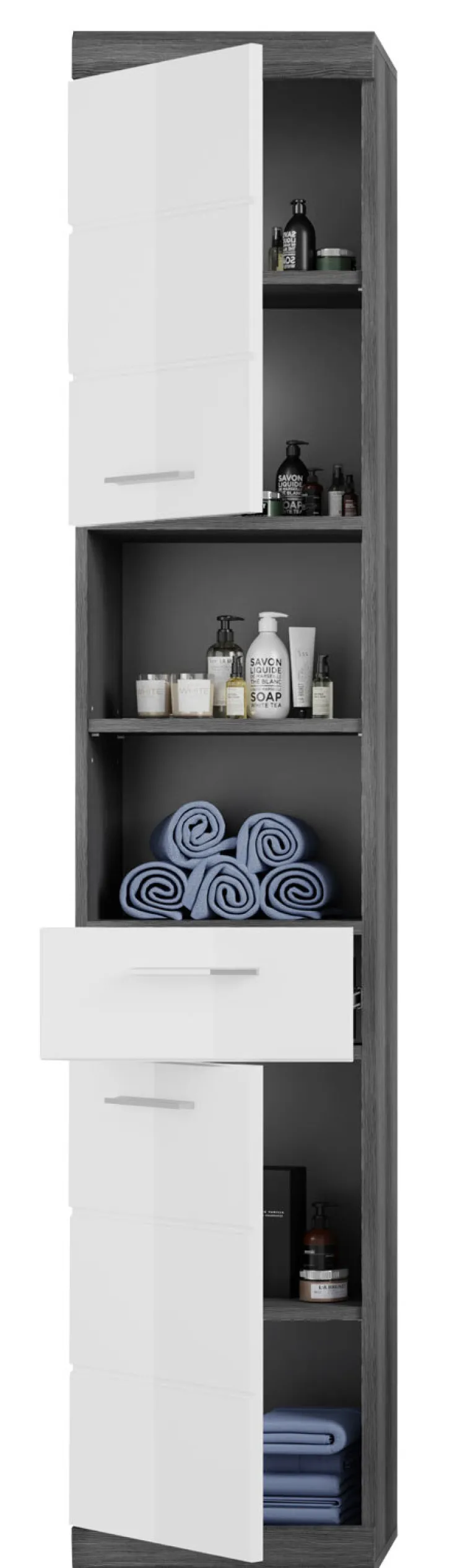 Der Hochschrank verbindet auf gekonnte Weise praktischen Nutzen mit einem modernen Design, das sich vor allem durch Funktionalität auszeichnet. Dank der dezenten Farbwahl in Dunkelgrau und Weiß spielt sich der Schrank nicht in den Mittelpunkt, sodass er sich beispielsweise gut ins Bad einzufügen weiß. Für jede Menge Stauraum sorgen das Schubfach und die Ablagen, die teilweise offen zugänglich und teilweise hinter den Türen verborgen sind. Wer das Design der SCOUT-Serie mag, findet in unserem Shop weitere passende Möbel.