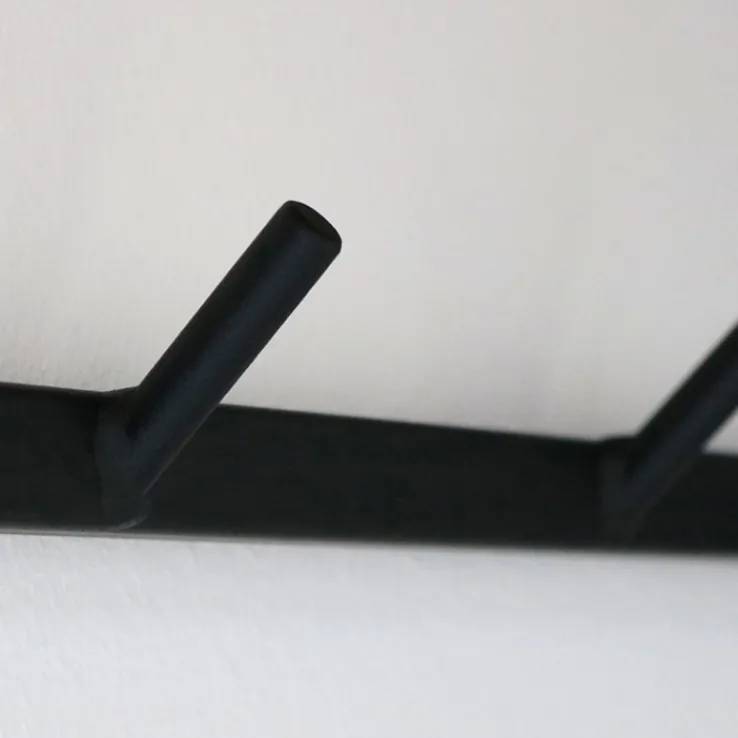 Die holz4home Wandgarderobe mit einer Länge von 92 cm und einer Höhe von 22 cm nimmt nicht viel Platz ein und passt auch in den kleinen Flur. Die Konstruktion ist aus Stahl gefertigt und mit einer schwarzen Pulverlackierung überzogen. Alle Kanten sind leicht abgerundet, so dass man sich nicht daran verletzen kann.