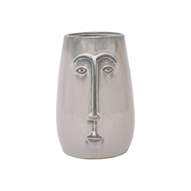 Die ungewöhnliche Vase zeigt ein stilisiertes Gesicht, das nur aus Augenbrauen, Augen, Nase und Mund besteht. Der Mund ist geschlossen und den Ausdruck der Augen kann jeder Betrachter individuell interpretieren. Es bleibt offen, ob das Gesicht weiblich oder männlich ist. Die schicke Vase darf jederzeit als Einzelstück ohne jeden Inhalt aufgestellt werden, denn sie ist ein wunderbares Deko-Element. Ansonsten kann in ihre große obere Öffnung ein kräftiger bunter Blumenstrauß oder eine elegante Solitärpflanze eingefüllt werden.