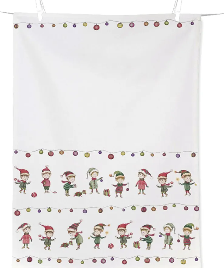 Dieses Geschirrtuch aus der Serie ELVES AT WORK besteht aus Naturfaser, genauer gesagt aus Baumwolle. Das Textil ist in einem hellen Beigeton gehalten, mit cremefarbener Anmutung. Das Design zeichnet sich durch eine umlaufende Bordüre mit kleinen, bunt gekleideten Wichtelfiguren aus, die in zwei Reihen dargestellt sind. Die Figuren sind jeweils von bunten, weihnachtlich inspirierten Kugelgirlanden eingerahmt, die in leuchtenden Farben wie Rot, Grün, Lila und Gelb gehalten sind.