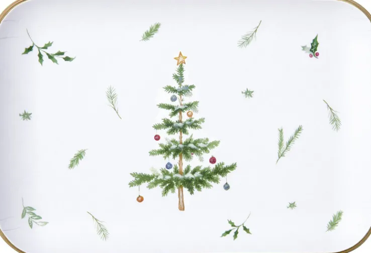 Dieses Tablett aus der Serie FESTIVE HOLIDAYS besteht aus Holz und misst 20 cm in der Breite, 13 cm in der Tiefe und 15 cm in der Höhe. Die Hauptfarbe ist Grün, unterstützt durch einen weißen Hintergrund. Das Motiv auf der Oberfläche zeigt einen geschmückten Weihnachtsbaum mit kleinen, farbigen Kugeln und einem goldenen Stern an der Spitze. Um den Baum herum sind verschiedene grüne Tannenzweige und Blätter verteilt. Das Tablett besitzt eine rechteckige Form mit abgerundeten Ecken und einem schmalen, goldfarbenen Rand. Die Oberfläche wirkt glatt und die Gestaltung ist klar auf das weihnachtliche Thema abgestimmt.