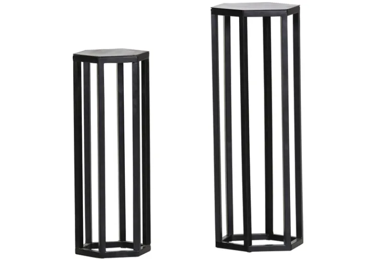 Die beiden Tische sind aus Metall gefertigt und verfügen über eine pulverbeschichtete Oberfläche, die für eine matte und widerstandsfähige Optik sorgt. Durch ihre sechseckige Form und die offene, strebenartige Gestellstruktur entsteht ein moderner, geometrischer Eindruck, der sich klar vom klassischen Tischdesign abhebt.