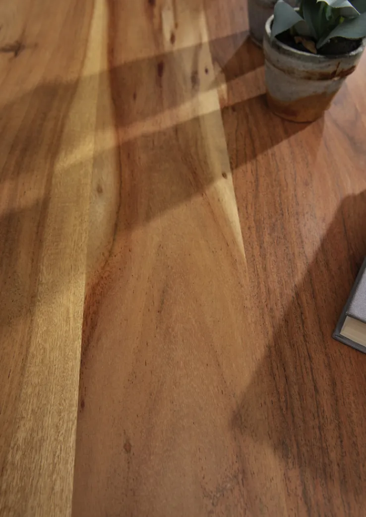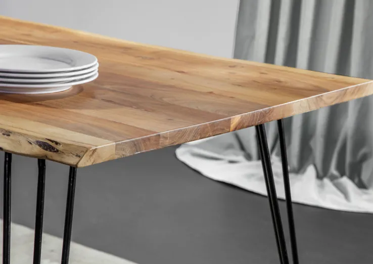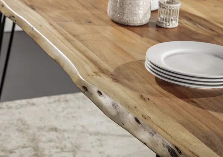 Der INTERhome Esstisch GRAHAM nutzt als Tischplatte die natürliche, massive, lackierte und gebeizte Akazie, wodurch die Tischplatte einerseits pflegeleicht ist, andererseits aber auch in einem kräftigen Braunton erstrahlt. Da keine Maserung der Akazie völlig identisch ist, avanciert die Tischplatte im Ess- und Wohnzimmer oder der Küche sogar zum Einzelstück.