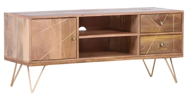 Das extravagante INTERhome Lowboard SCAN hat eine Größe von 130 x 57 x 52 cm. Es ist aus gebeiztem und lackiertem Mango Massivholz gefertigt und begeistert mit hervorragender Qualität und einem edlen Design mit asymmetrischen Formen. Die Einfräsungen an den Fronten und die goldfarbig pulverbeschichteten Füße und Griffe perfektionieren den spannenden Look. Zusätzlich zum stylischen Look überzeugt das Lowboard mit zwei geräumigen Schubkästen, zwei offenen Fächern für Geräte und einem kleinen Schrankteil.