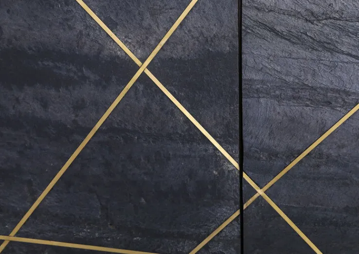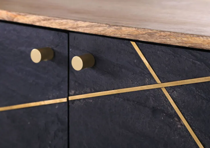 Das braun- und schwarzfarbige Sideboard LEVI mit einem Korpus aus massivem Mangoholz ist ein Allrounder für das Wohnzimmer, Esszimmer, Schlafzimmer, den Flur oder das Gästezimmer. Blickfang des 145 cm breiten, 80 cm hohen und 42 cm tiefen Sideboards sind die extravagant gemusterten Türen mit geometrischen Messingapplikationen auf einer Echtstein-furnierten Front aus MDF. Für hohe Standfestigkeit sorgt das aufwendig gestaltete Fußgestell aus Messing, das der Kommode einen leichten Vintage-Look verleiht. Das Sideboard macht als Einzelstück oder in Kombination mit anderen Möbelstücken der gleichen Serie einen hochwertigen Eindruck.