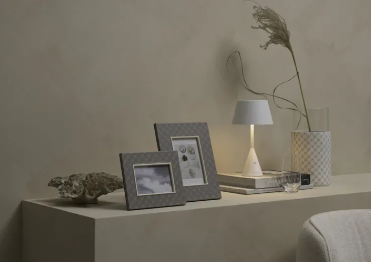Der rechteckige Bilderrahmen aus der Serie CORNFLOWER von JOOP! zeichnet sich durch sein modernes Design und eine hochwertige Textiloberfläche in Kunstleder aus. Die Oberfläche zeigt ein gleichmäßiges, dezentes Muster in grau-weißen Tönen, das dem Rahmen eine elegante und zurückhaltende Optik verleiht. Mit einer Hauptfarbe in Grau und feinen weißen Akzenten integriert sich der Rahmen harmonisch in verschiedene Wohnbereiche wie Wohnzimmer, Schlafzimmer oder Esszimmer.
