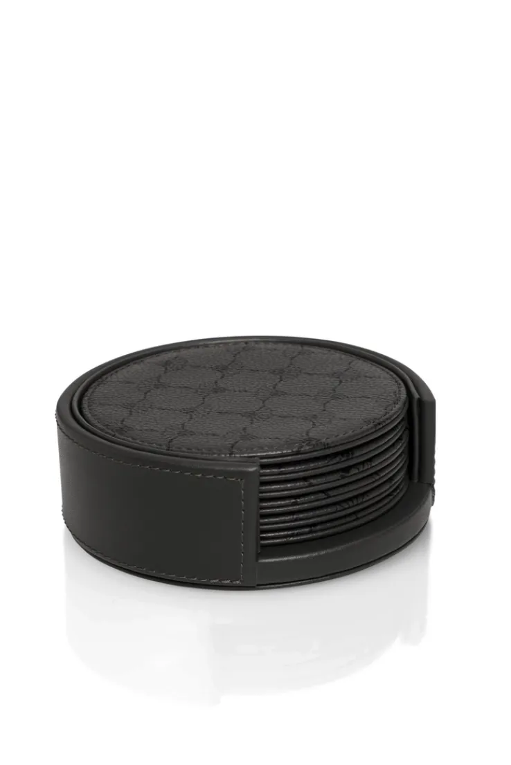 Jeder Untersetzer hat einen Durchmesser von 11,50 cm und eine Höhe von 4,50 cm. Das Gewicht beträgt 0,20 kg pro Untersetzer. Die Farbgebung ist anthrazit-schwarz mit einer grauen Grundfarbe, ergänzt durch eine charakteristische, dezente Musterprägung auf der Oberfläche.