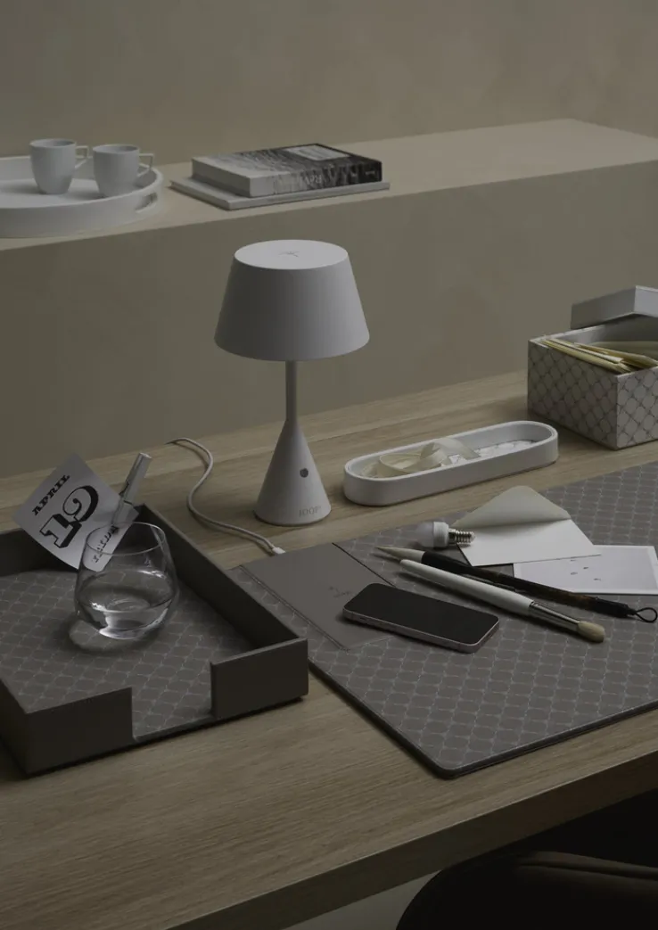 Der Tischschoner besteht aus einem hochwertigen Kunstleder mit einer feinen, leicht strukturierten Textiloberfläche, die für einen modernen Stil sorgt. Das Design zeigt ein dezentes, grau-weißes Muster mit wiederkehrenden grafischen Elementen, das dem Schreibtisch eine elegante Optik verleiht. Die Hauptfarbe ist Grau, ergänzt durch weiße Akzente. Die Farbgebung wirkt neutral und passt sich verschiedenen Einrichtungsstilen an. Das Gewicht beträgt 1,2 kg, wodurch die Schreibunterlage stabil auf der Arbeitsfläche liegt. Geeignet ist der Artikel insbesondere für den Einsatz im Arbeitszimmer.