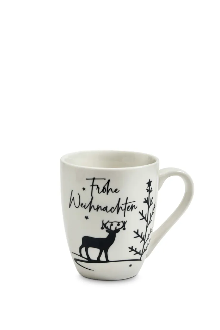 Die Kaffeetasse aus der Serie BLACK FORREST besteht aus weißem Porzellan und hat eine Höhe von 10 cm sowie einen Durchmesser von 8,5 cm. Das Fassungsvermögen beträgt 300 ml. Das Design zeigt einen schwarzen Hirsch, einen stilisierten Baum sowie den Schriftzug ‚Frohe Weihnachten‘ in Schwarz auf weißem Hintergrund. Die Oberfläche ist glatt und glänzend, typisch für Porzellan. Die Tasse ist für den Einsatz im Innenbereich, besonders im Wohnzimmer, geeignet und eignet sich aufgrund des Motivs besonders für die Weihnachtszeit. Das Material Keramik sorgt für eine angenehme Haptik und Stabilität.
