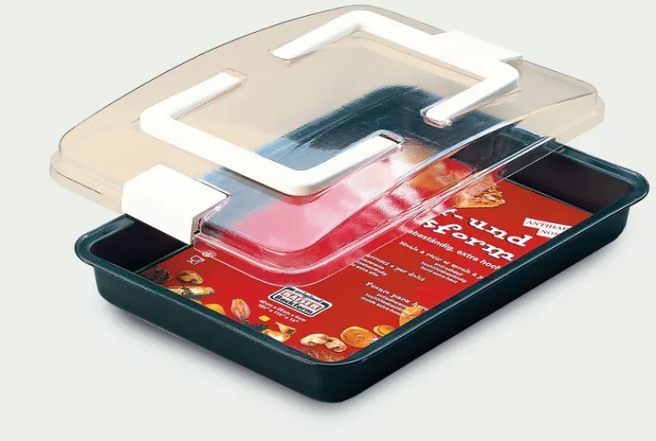 Diese praktische KAISER Backform aus schwarzem, antihaftbeschichtetem Stahl überzeugt mit einer Größe von 42 x 29 x 4 cm, vielfältigen Nutzungsmöglichkeiten und praktischen Detaillösungen wie einer hochwertigen Transporthaube mit klappbarem Griff.