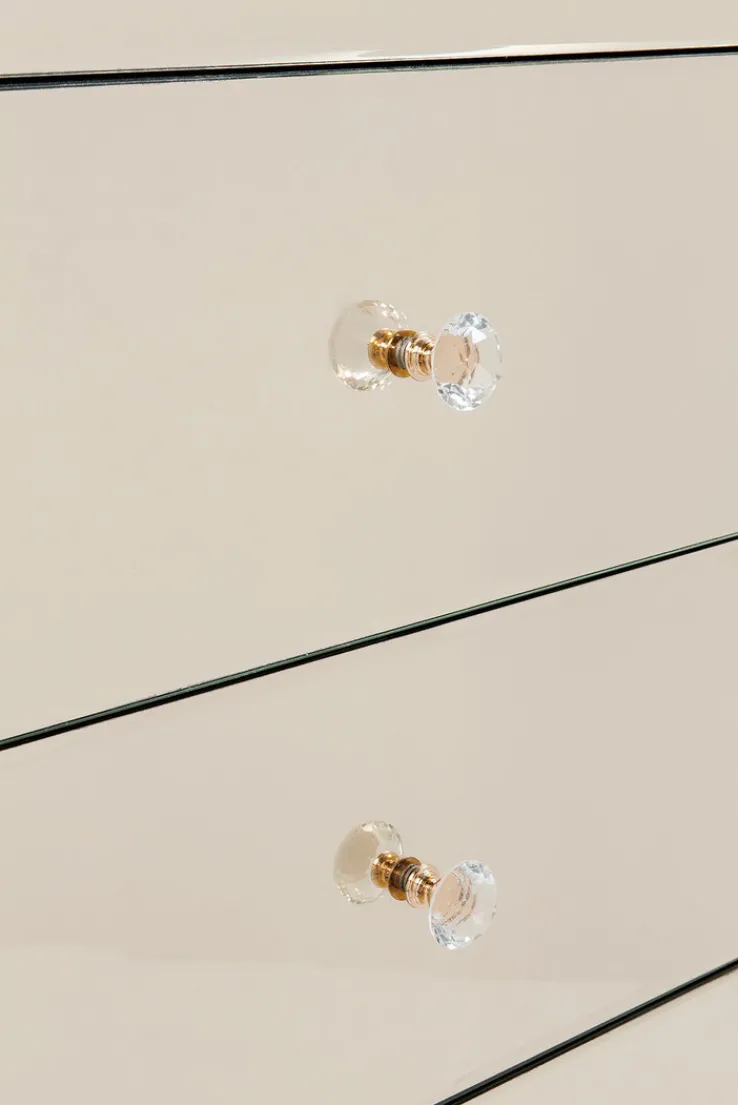 Der Korpus der Hochkommode ist aus einer mitteldichten Faserplatte mit lackierter Oberfläche gefertigt. In Verbindung mit Füßen aus massivem Tannenholz, einer verspiegelten Front sowie Griffen aus klarem Glas ist die KARE DESIGN Hochkommode ein absolutes Schmuckstück in allen Wohnräumen. Die fünf Schubkästen bieten reichlich Stauraum zur Aufbewahrung von Wäschestücken, Kleidungsaccessoires und anderen Gegenständen des täglichen Bedarfs. Durch ihre geringe Breite ist die Hochkommode ein idealer Ordnungshüter auch in kleinen Fluren oder im Schlafzimmer.