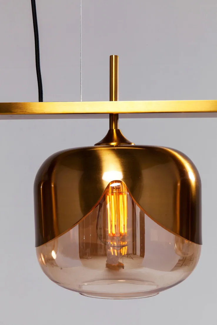 Die KARE DESIGN Retrofit Hängelampe GLOBLET QUATTRO hängt 143 cm von der Decke und ist mit ihren vier Lampenschirmen 129 cm breit. Ihre Lampenschirme kombinieren Farbglas mit messingfarbig beschichtetem Stahl, wodurch sie wie umgedrehte Kelche wirken. Für jeden Lampenschirm wird zusätzlich eine 40 Watt AGL oder Retrofit Glühbirne mit E27 Fassung benötigt. Die zweifarbigen Lampenschirme sorgen für ein stilvolles, blendfreies Licht und schaffen ein komfortables Ambiente, in dem sich Familie und Freunde gerne aufhalten.