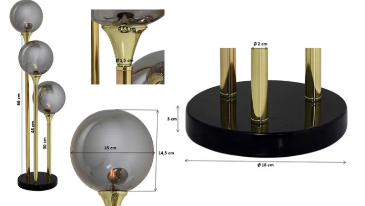 Das hochwertig verarbeitete Gestänge der Stehlampe besteht aus Stahl und hat polierte Oberflächen. Die Lampenschirme sind aus Farbglas hergestellt und der Fuß ist aus echtem Marmor gefertigt. Die Brennstellen sind mit G9-Fassungen für AGL-, Retrofit- und LED-Leuchtmittel bis 25 Watt ausgestattet.