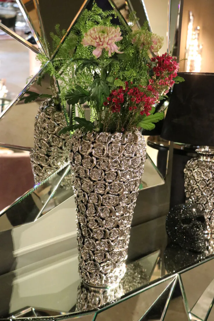Die Retrofit Tischlampe ROSE MULTI von KARE DESIGN schafft durch ihr außergewöhnliches Design in Schwarz/Silberfarbig und ein sanftes Licht eine einzigartige Atmosphäre. Stilvoll und elegant kontrastiert der Lampenfuß mit glänzenden Rosenblüten mit dem Lampenschirm in matter Velours-Optik.
