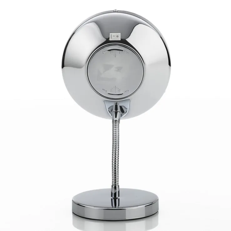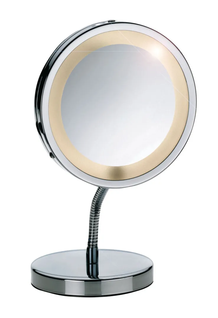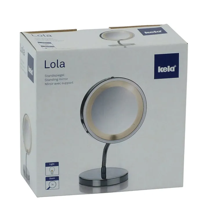 Der hochwertige Spiegel besteht aus robustem Metall und ist verchromt. Die Basis bildet ein verstellbarer Standbetrieb. Darauf befindet sich ein runder Metallrahmen. In dessen Inneren ist die Spiegelfläche aus Glas. Diese bietet eine 3-fache Vergrößerung, sodass ein besonders präzises Schminken damit möglich ist. Außerdem ist er mit einer batteriebetriebenen Beleuchtung ausgestattet. Diese sorgt für das optimale Kosmetiklicht. Der kela Standspiegel LOLA hat einen Durchmesser von 15 cm.
