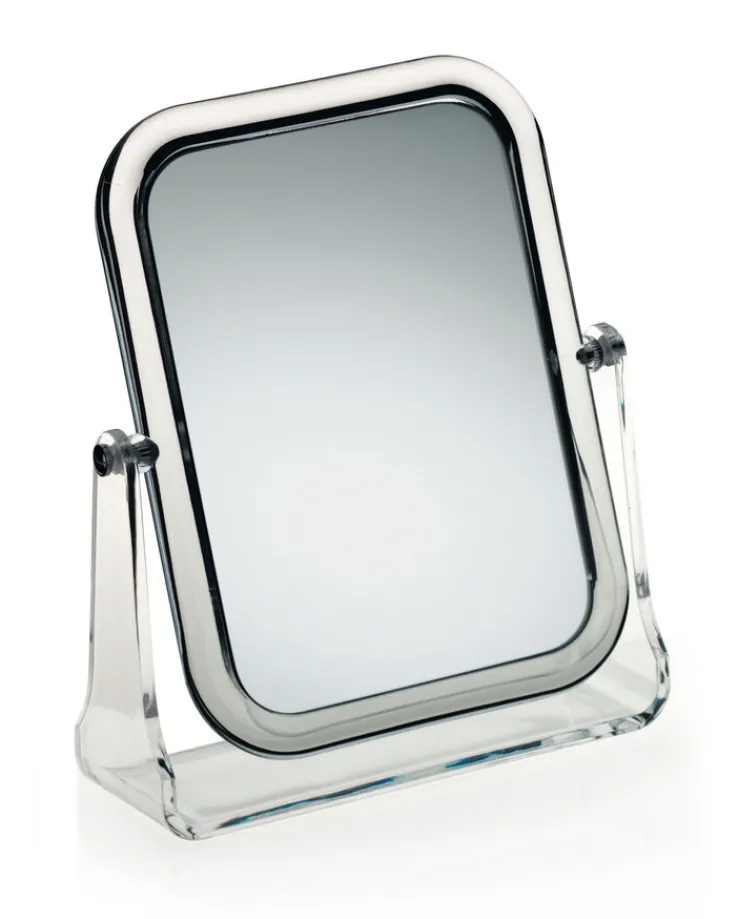 Der silberfarbige Rahmen und der transparente Fuß des Tischspiegels bestehen aus hochwertig verarbeitetem Acryl. Das strapazierfähige und robuste Material hat glatte Oberflächen. Die Vorrichtungen zum Schwenken des Spiegels sind ebenfalls aus Kunststoff gefertigt. Der in den stabilen Rahmen eingefasste Spiegel ist aus echtem Spiegelglas gefertigt.
