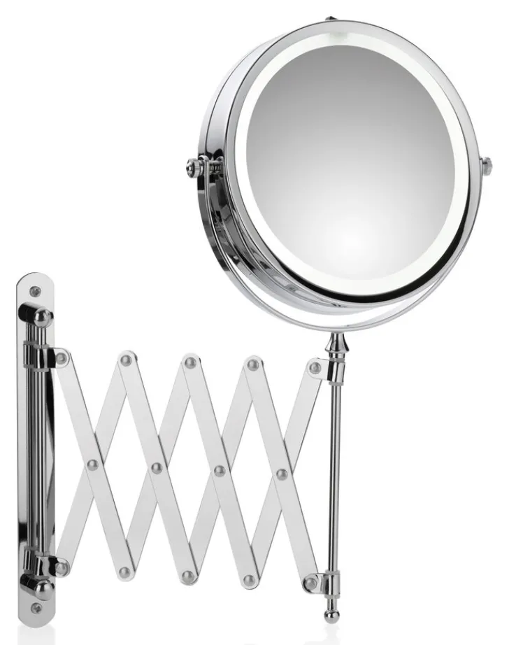 Der ausziehbare Wandspiegel VALERIA von kela ist die ideale Ergänzung für Badezimmer oder Duschen mit einem kleineren Raumangebot. Die Halterung ist gleichzeitig schwenkbar und der in zwei Gelenke eingehängte Spiegel ist drehbar. Für eine optimale Ausleuchtung des Gesichts ist der runde Wandspiegel mit einer hellen LED-Beleuchtung ausgestattet. Die Spiegel auf der Vorder- und der Rückseite sorgen für eine einfache oder dreifache Vergrößerung.