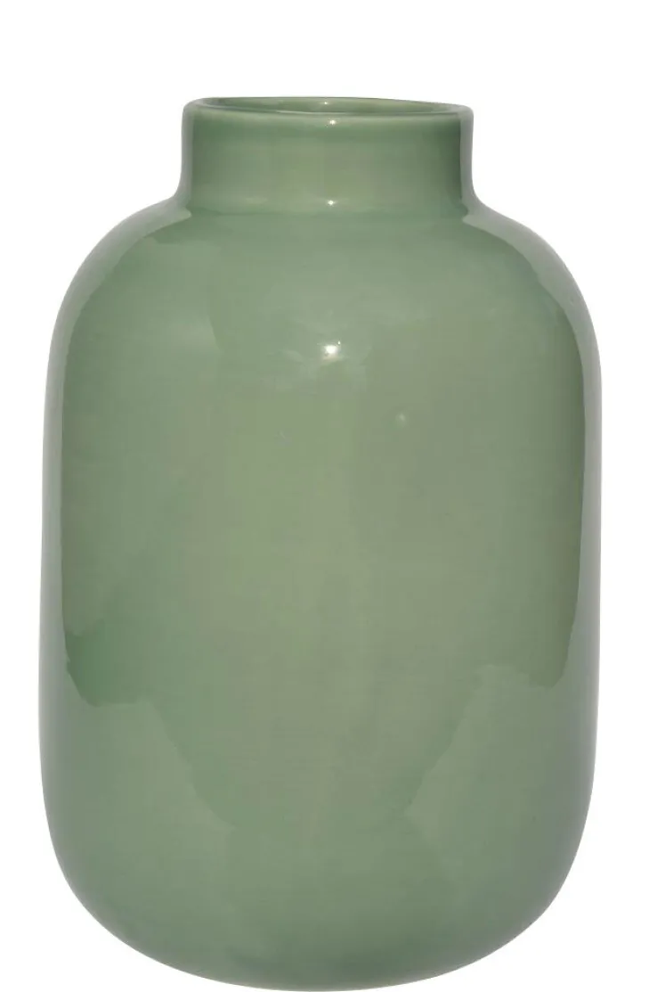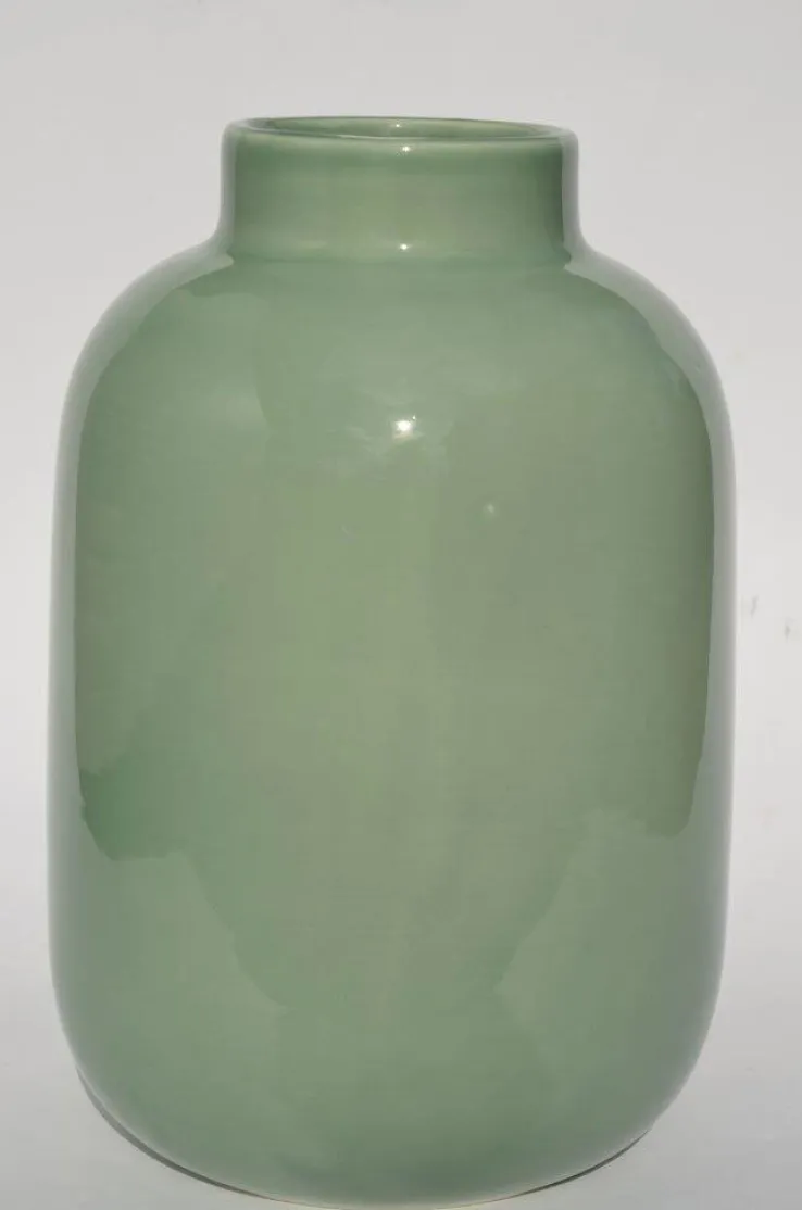 Die formschöne Keramik Vase ist in einem grünen Farbton gestaltet, der an Salbei erinnert. Sie ist 18 cm hoch, bauchig und hat eine glatte Oberfläche, die einen schönen Glanz hat.