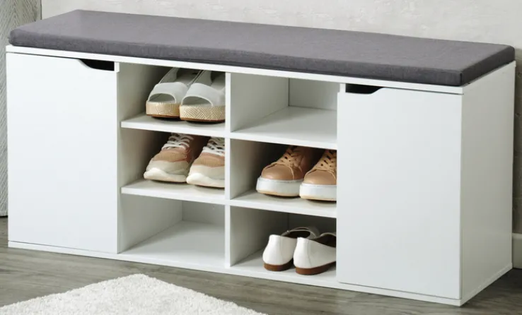 Mit einer Breite von 103 cm, einer Höhe von 48 cm und einer Tiefe von 30,5 cm passt er perfekt in jeden Eingangsbereich. Die Hauptfarbe ist Weiß, das dem Möbelstück eine moderne und elegante Optik verleiht. Die gepolsterte Sitzfläche in Grau bietet zusätzlichen Komfort und macht das Anziehen der Schuhe besonders bequem.