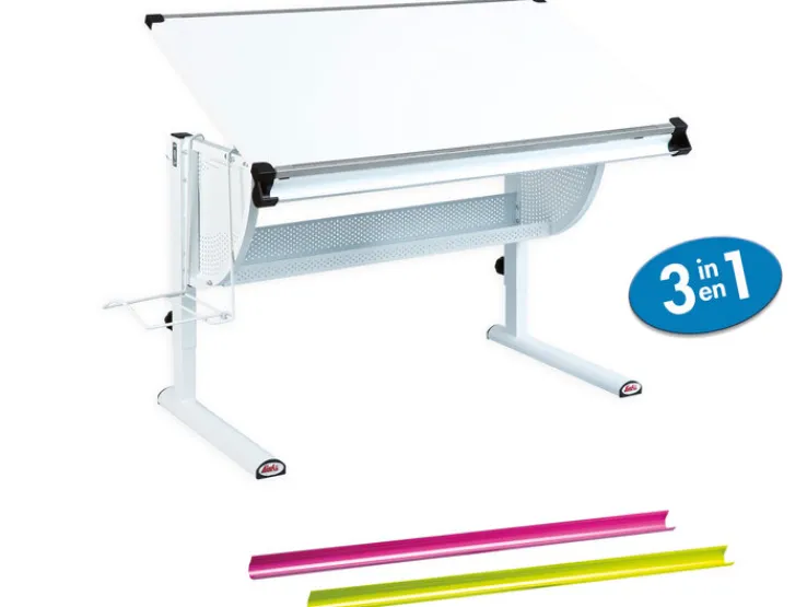 Der weißfarbige Kinder Schreibtisch MIKA lädt dazu ein, entspannte Stunden beim Malen, Schreiben, Rechnen, Spielen und Basteln zu verbringen. Mit einer Breite von 118 cm, einer Tiefe von 72,5 cm und einer individuell einstellbaren Höhe von 63 cm bis 96 cm bietet das moderne Möbelstück beste Voraussetzungen für eine lange Nutzungsdauer. Der stylishe Schreibtisch im Farbton Weiß macht sowohl im Wohnbereich als auch im Kinderzimmer eine ausgezeichnete Figur. Highlights des wandelbaren Möbelstückes sind die neigbare Tischplatte in Holzoptik sowie die wechselbare Applikation in zwei trendigen Farbtönen.