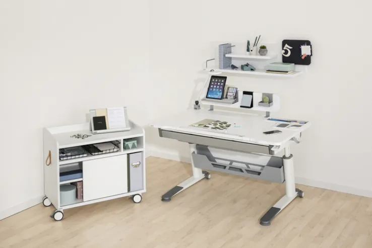 Der moderne Schreibtisch JARO von PAIDI im attraktiven Farbton kreideweiß überzeugt durch sein stilvolles Design und ist eine praktische Ergänzung für das geschmackvoll eingerichtete Kinder- oder Jugendzimmer. Kombiniert mit einem hochwertigen Bürostuhl aus der Möbelserie entsteht ein elegantes Ensemble. Die Tischplatte und die Ablage bieten viel Platz und zusätzlichen Stauraum. Der Schreibtisch ist individuell höhenverstellbar und mit jeweils zwei Möbelrollen an den Füßen einfach umzustellen.