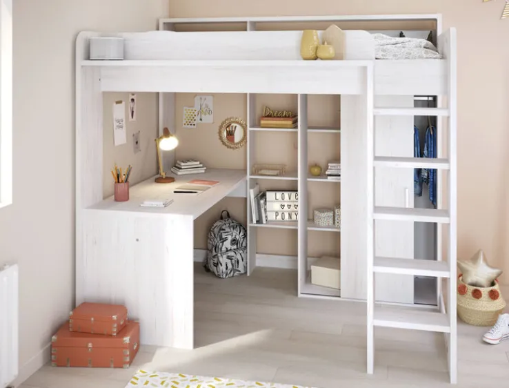 Trendig aus Holznachbildung in nordischer Eiche und nahezu ein Zimmer für sich: Unter dem Hochbett mit Leiter bieten ein Kleiderschrank, ein Schreibtisch und unterschiedliche Ablageflächen viel Stauraum. Für Ordnung und Übersicht sorgen zudem im Schrank eine Kleiderstange und Einlegeböden, die Ablagen vor dem Bett und im offenen Regal sind perfekt, um Gebrauchsgegenstände aufzubewahren und Deko stimmig zu arrangieren. Das Hochbett HIGHER 1 wird zerlegt geliefert, eine einfach verständliche Montageanleitung und Pflegehinweise gehören zum Lieferumfang.