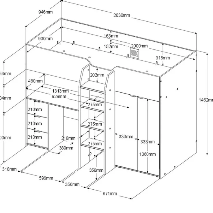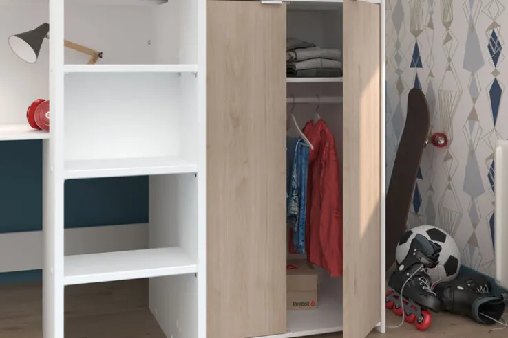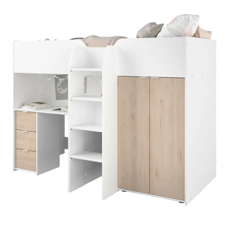 Das Parisot Hochbett TOM 1 in Weiß/ Braun bietet viel Stauraum bei möglichst wenig Platzbedarf und ist auch für kleine Kinderzimmer eine hervorragende Wahl. Neben der 90 x 200 cm großen Liegefläche wartet es mit einem integrierten Kleiderschrank und Schreibtisch mit Schubkästen auf.