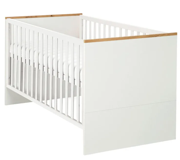 Der stabile Korpus des Kinderbetts besteht aus hochwertig verarbeiteten Spanplatten. Die Oberflächen des Betts sind in der Farbe weiß lackiert. Die oberen Kanten des Betts sind im Dekor Goldeiche abgesetzt. Die stabilen Sprossen des Kinderbetts sind aus massiver Buche und ebenfalls weiß lackiert. Der dreifach verstellbare Lattenrost ist im Lieferumfang enthalten.