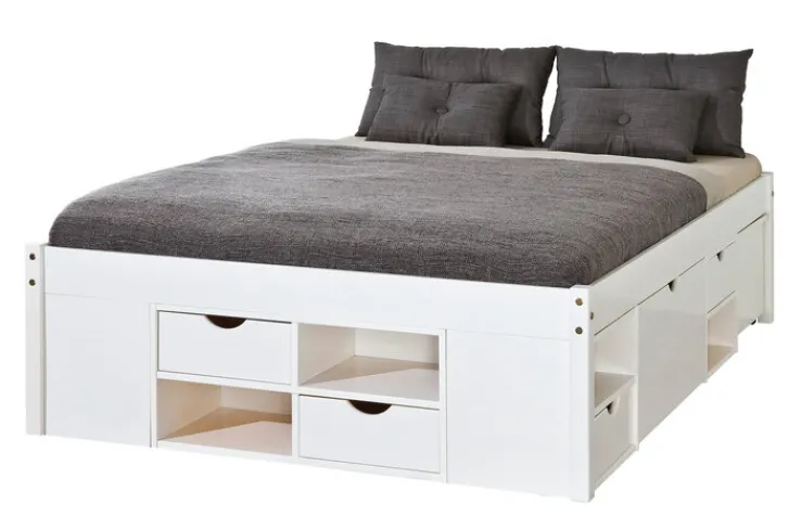 Das Stauraum-/Funktionsbett LAURO besteht aus weiß lackiertem Kiefer Massivholz. Es benötigt eine Stellfläche von 186 x 47,5 x 209 cm und lässt sich mit maximal 200 kg belasten. Die Besonderheit des Bettes ist das Stauraum-Bettgestell. Dieses bietet mehrere offene Fächer und Schubkästen, in denen sich Alltagsgegenstände, Wäsche und Bücher aufbewahren lassen. Das Funktionsbett kommt allerdings nicht alleine, sondern mit zwei passenden Nachtschränken und Lattenrosten nach Hause.