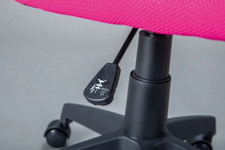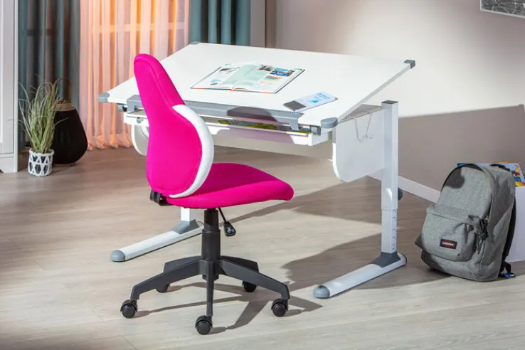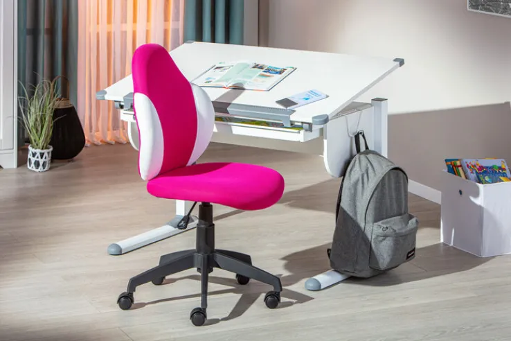 Der Kinderstuhl JEREMY himbeerfarbig/weiß 52 x 92-102 x 56 cm ist bi 80 kg belastbar. Durch seinen Wippmechanismus, die Höhenverstellbarkeit und die Drehbarkeit ist der Schreibtischstuhl mit Kunststoffgestell ergonomisch.