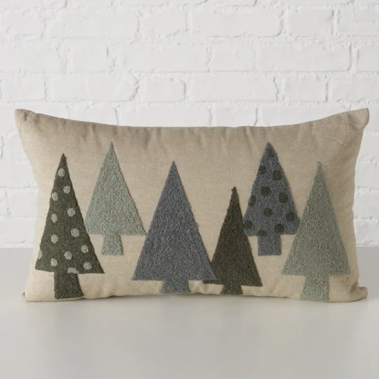 Das Weihnachtskissen aus der Serie MALI vereint stilvolles Design mit hochwertigen Materialien. Mit einer Breite von 30 cm, einer Höhe von 15 cm und einer Tiefe von 50 cm bietet es eine ideale Größe für gemütliche Stunden auf dem Sofa. Das Kissen besticht durch seine mehrfarbige Gestaltung, die auf einem natürlichen Hintergrund aus Baumwolle zur Geltung kommt. Die Vorderseite zieren stilisierte Tannenbäume in verschiedenen Grüntönen, die durch ihre unterschiedliche Textur und Muster, wie Punkte, eine interessante Optik bieten.