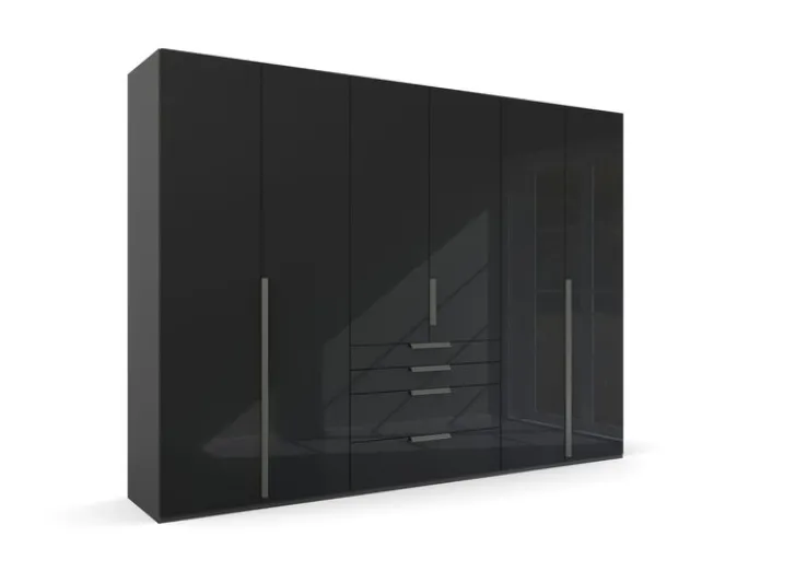 Der Kleiderschrank PURISMA besteht aus hochwertiger Holznachbildung und misst 301 x 223 x 60 cm. Mit einer Kombination aus dunklem Farbglas und markanten Griffen wirkt der Schrank top modern. Noch bedeutender als sein trendige Design ist jedoch sein Stauraum. Hinter sechs Drehtüren mit Dämpfer bietet der Kleiderschrank Kleiderstangen und Ablageböden sowie einen Krawattenhalter. Darüber hinaus ist der Schrank mit vier Schubkästen in zwei Größen ausgestattet, die über einen praktischen Selbsteinzug verfügen.