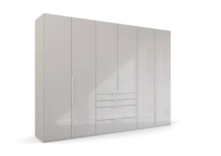 Der Kleiderschrank PURISMA benötigt eine Stellfläche von 301 x 223 x 60 cm. Er besteht aus solider Holznachbildung und ist mit Farbglasfronten versehen. Ganz in Seidengrau strahlt der Schrank minimalistische Modernität aus und lässt sich dadurch vielseitig kombinieren. Zusätzlich zur ansprechenden Optik punktet der Kleiderschrank mit seinem Stauraum in Schubkästen und sechs Schrankteilen. Hinter den Drehtüren bietet er mehrere Ablageböden, Kleiderstangen und einen Krawattenhalter.